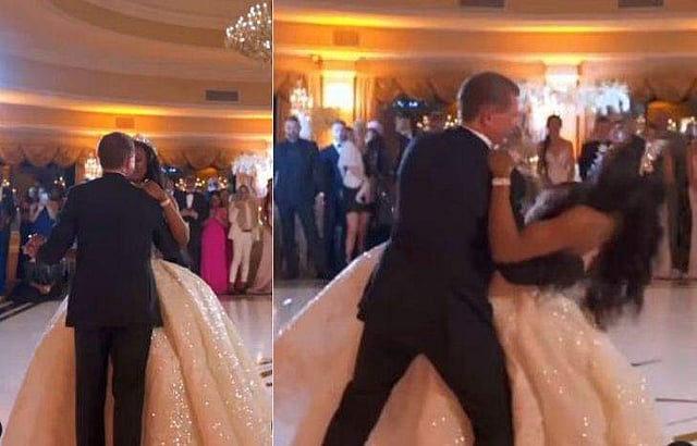 വിവാഹത്തിനെത്തിയ അതിഥികളെല്ലാം നോക്കിനിൽക്കെ പാട്ടിനൊപ്പം ആദ്യമായി കൈകൾ കോർത്തുപിടിച്ച് ചുവടുവയ്ക്കുകയായിരുന്നു മരിയയും ഭർത്താവ് ഡേവിഡും. എന്നാൽ മരിയയെ ഒരു കൈയിൽ താങ്ങുന്നതിനിടെ കാര്യങ്ങൾ കൈവിട്ടുപോയി. ഇരുവരും ദാ കിടക്കുന്നു നിലത്ത്.