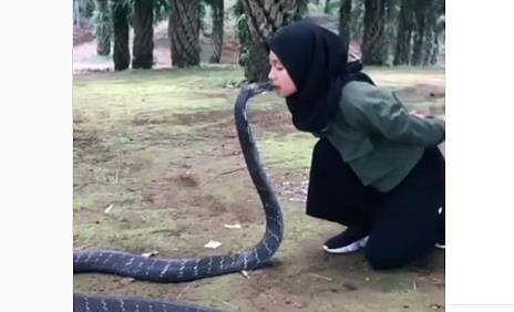 റസല് വൈപ്പര് എന്ന പേരിലുള്ള ഇന്സ്റ്റാഗ്രാം അക്കൗണ്ടില് നിന്നാണ് വീഡിയോ പങ്കുവെച്ചിരിക്കുന്നത്. രാജവെമ്പാലയുടെ അടുത്ത് വന്ന് ഒരു ഭയവുമില്ലാതെ പെണ്കുട്ടി പത്തിയില് ചുംബിച്ചു. വീണ്ടും ഇത് ആവര്ത്തിച്ചു. ഈസമയത്ത് ഒരു ആക്രമണത്തിനും മുതിരാതെ വേറിട്ട സ്വഭാവവുമായി പാമ്പ് നില്ക്കുന്നത് സാമൂഹിക മാധ്യമങ്ങളെ അടക്കം അമ്പരപ്പിച്ചു.