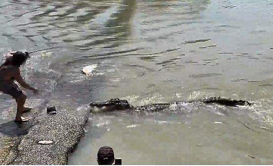 അച്ഛനും മകനും ചൂണ്ടയിടുന്നതിനിടെയാണ് മുതല തീരത്തേക്ക് കയറി വന്നത്. ചൂണ്ടയില് കുടുങ്ങിയ മീനിനെ മുതല പിന്തുടരുന്നതിനിടെ മകന്റെ തലയില് നിന്ന് തൊപ്പി താഴെ വീഴുകയായിരുന്നു. മീനിനെ പിടിക്കാനുള്ള ശ്രമത്തില് യുവാവിന്റെ ശ്രദ്ധയില് ആദ്യം പെട്ടിരുന്നില്ല. പിന്നീട് തൊപ്പിയെടുക്കാന് ശ്രമിക്കാതെ യുവാവ് രക്ഷപ്പെടുകയായിരുന്നു.