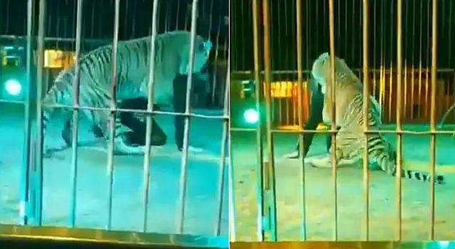.കാലിലും കഴുത്തിലുമായിട്ടാണ് കടുവ പല്ലുകള് ആഴ്ത്തിയിട്ടുള്ളത്. പ്രദര്ശനം കാണാനെത്തിയ ആളുകളുടെ നിലവിളിയും വീഡിയോയില് കേള്ക്കാം.