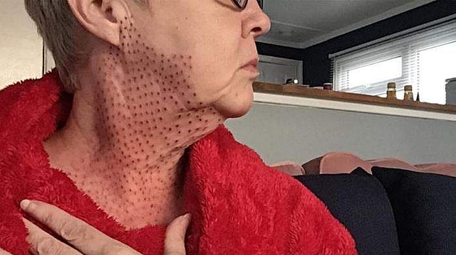 ലണ്ടന്‍: കഴുത്ത് തൂങ്ങുന്നത് പരിഹരിക്കാന്‍ ചികിത്സ തേടിയ 59കാരിക്ക് ദുരനുഭവം. ചികിത്സാപിഴവ് മൂലം പല്ലിയുടെ പോലെ 59കാരിയുടെ കഴുത്ത് നിറയെ കറുത്ത കുത്തുകള്‍ പ്രത്യക്ഷപ്പെട്ടിരിക്കുകയാണ്.