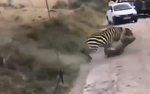 റോഡിലൂടെയും മറ്റു വലിച്ചിഴച്ചാണ് സീബ്ര സിംഹത്തെ കൊണ്ടുപോയത്. നിവൃത്തിയില്ലാതെ സിംഹം പിടിവിടുന്നതും സീബ്രയുടെ പിന്നാലെ ഓടുന്നതുമാണ് വീഡിയോയുടെ അവസാനം. ഒരു ഘട്ടത്തിലും പതറാതെ ധീരമായാണ് സീബ്ര, സിംഹത്തോട് ഏറ്റുമുട്ടിയത്. പുല്ലു തിന്നുന്നതിനിടെയാണ് സീബ്രയെ സിംഹം ആക്രമിച്ചത്. 2021ലെ വീഡിയോയാണ് ഇപ്പോള് പ്രചരിക്കുന്നത്.