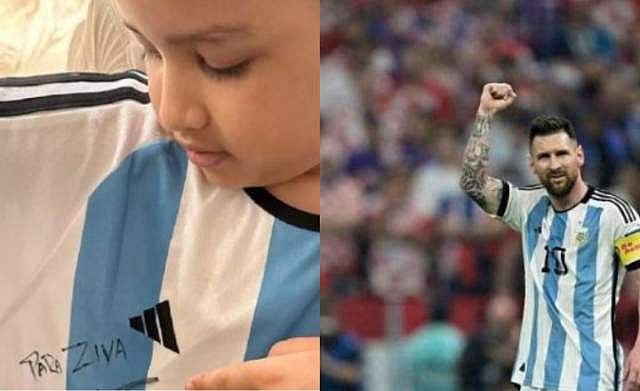 മെസിയുടെ കയ്യൊപ്പോടെയുള്ള അര്ജന്റൈന് ജഴ്സി അണിഞ്ഞ് നില്ക്കുന്ന സിവയുടെ ചിത്രം സിവയുടെ ഇന്സ്റ്റഗ്രാം അക്കൗണ്ടിലൂടെയാണ് പങ്കുവെച്ചത്. അച്ഛനെ പോലെ, മകളെ പോലെ എന്നാണ് ഫോട്ടോയ്ക്കൊപ്പം കുറിച്ചത്.