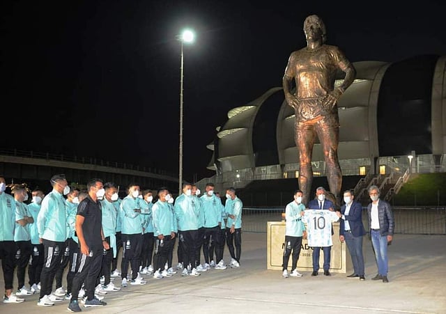 ഇക്കഴിഞ്ഞ മാര്ച്ചില് ഉദ്ഘാടനം ചെയ്ത മഡ്രെ ഡി സിയുഡെഡ്സ് സ്റ്റേഡിയത്തിന് മുന്നിലാണ് ഇതിഹാസ താരത്തിന്റെ സ്മരണയ്ക്കായി പൂര്ണകായ വെങ്കല പ്രതിമ സ്ഥാപിച്ചത്. ലയണല് മെസിയുടെ നേതൃത്വത്തിലുള്ള ടീം അംഗങ്ങള് മത്സരത്തിന് മുന്പാണ് പ്രതിമ അനാച്ഛാദനം ചെയ്ത് ആദരം അര്പ്പിച്ചത്.
