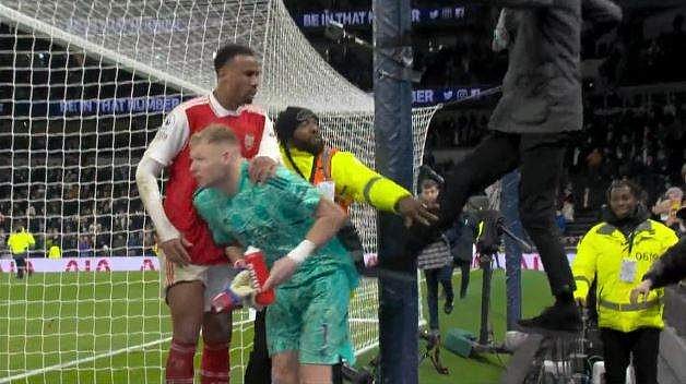 ലണ്ടന്‍: ഇംഗ്ലീഷ് പ്രീമിയര്‍ ലീഗിലെ നോര്‍ത്ത് ലണ്ടന്‍ ഡെര്‍ബി അവസാനിച്ചതിന് പിന്നാലെ ആഴ്‌സണല്‍ ഗോള്‍ കീപ്പര്‍ ആരോണ്‍ റാമ്‌സ്ഡലിന് ആരാധകന്റെ ചവിട്ടേറ്റു. ടോട്ടനത്തിനെതിരായ പോരാട്ടത്തിന് പിന്നാലെയാണ് നാടകീയ സംഭവങ്ങള്‍.
