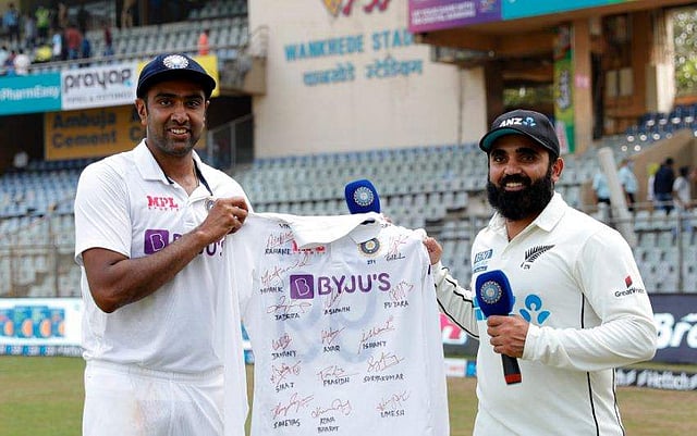മുംബൈ ടെസ്റ്റിന് പിന്നാലെ അശ്വിന് പങ്കുവെച്ച ചിത്രവും ആരാധകര് ഏറ്റെടുത്തിരുന്നു. നാലു താരങ്ങള് അവരവരുടെ ജഴ്സിയുമിട്ട് നിന്നപ്പോള് രണ്ട് ഇന്ത്യന് ക്രിക്കറ്റ് താരങ്ങളുടെ പേരാണ് തെളിഞ്ഞത്. ഇന്ത്യന് താരം അക്സര് പട്ടേല്, കിവീസ് താരങ്ങളായ അജാസ് പട്ടേല്, രവീന്ദ്ര രചിന്, ഇന്ത്യന് ഓള്റൗണ്ടര് രവീന്ദ്ര ജഡേജ എന്നിവരുടേതാണ് ചിത്രങ്ങള്.