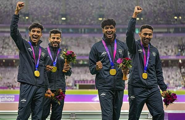 ഹാങ്ചൗ: ഏഷ്യൻ ഗെയിംസ് റിലേയിൽ ഇന്ത്യൻ കുതിപ്പ്. പുരുഷ റിലേയിൽ സ്വർണവും വനിതാ റിലേയിൽ വെള്ളിയും ഇന്ത്യന് ടീം നേടി. പുരുഷൻമാരുടെ 4–400 മീറ്റർ റിലേയിൽ മലയാളി താരങ്ങളായ മുഹമ്മദ് അനസ്, മുഹമ്മദ് അജ്മൽ, അമോജ് ജേക്കബ്, തമിഴ്നാട് സ്വദേശി രാജേഷ് രമേഷ് എന്നിവരടങ്ങുന്ന സംഘമാണ് സ്വർണം നേടിയത്. 3:01.58 സമയത്തിൽ ഓടിയെത്തി ദേശീയ റെക്കോർഡോടെയാണ് സ്വർണ നേട്ടം.