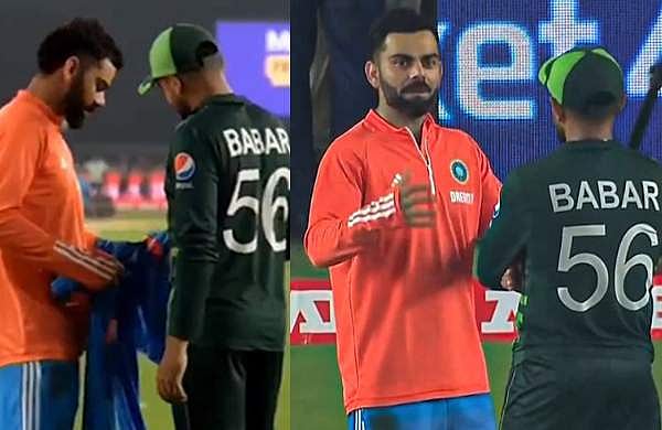 തന്റെ ബാറ്റിങിനെ പ്രചോദിപ്പിക്കുന്ന ഇന്ത്യന് സ്റ്റാര് ബാറ്റര് വിരാട് കോഹ്ലിയില് നിന്നു അദ്ദേഹത്തിന്റെ ജേഴ്സി ഒപ്പിട്ടു വാങ്ങിയത് മറ്റാരുമല്ല. പാകിസ്ഥാന് ക്യാപ്റ്റന് ബാബര് അസം. മത്സര ശേഷം ആരാധകരില് ഒരാള് സ്റ്റേഡിയത്തില് നിന്നു പകര്ത്തിയ വീഡിയോയാണ് ട്രെന്ഡിങായത്. മത്സര ശേഷം ബാബര് ജേഴ്സി ഒപ്പിട്ടു നല്കാന് ആവശ്യപ്പെടുകയായിരുന്നു.