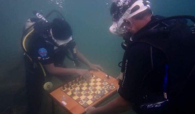 ചെസ്സ് ഒളിംപ്യാഡിനിടെ കടലിനടിയില്‍ ചതുരംഗക്കളി; 60 അടി താഴ്ചയില്‍ 'തമ്പിയും'