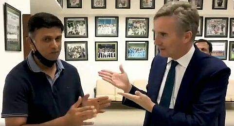 ഇപ്പോഴിതാ ദ്രാവിഡിന്റെ ഒരു വീഡിയോ ശ്രദ്ധേയമാകുന്നു. ഇന്ത്യയിലെ ബ്രിട്ടീഷ് ഹൈക്കമീഷണറായ അലക്സ് എല്ലിസിനെ കന്നഡ ഭാഷ പഠിപ്പിക്കുന്ന ദ്രാവിഡാണ് വീഡിയോയില്.