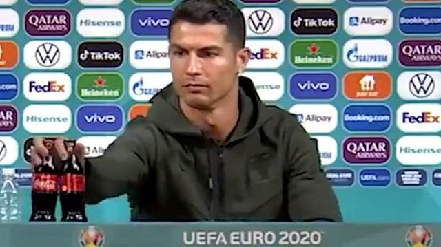 ബുദ്ധാപെസ്റ്റ്: യൂറോ കപ്പിൽ ഹംഗറിക്കെതിരായ മത്സരത്തിന് മുൻപ് ക്രിസ്റ്റ്യാനോ റൊണാൾഡോ പോർച്ചുഗൽ കോച്ചിനൊപ്പം നടത്തിയ പ്രസ് കോൺഫറൻസ് വലിയ ചർച്ചയായിരുന്നു. തന്റെ മുൻപിലിരുന്ന കൊക്കോ കോളയുടെ കുപ്പികൾ എടുത്ത് മാറ്റുകയായിരുന്നു ക്രിസ്റ്റ്യാനോ. ഇവിടെ രണ്ട് കൊക്കോ കോള കുപ്പികൾ ക്രിസ്റ്റ്യാനോ എടുത്ത് മാറ്റിയപ്പോൾ കമ്പനിക്ക് നഷ്ടമായത് 400 കോടി രൂപയെന്നാണ് റിപ്പോർട്ടുകൾ.