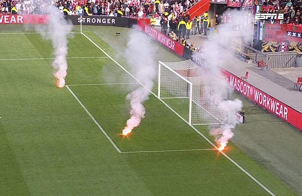 സ്വന്തം തട്ടകത്തില് അയാക്സിന്റെ മോശം പ്രകടനമാണ് ആരാധകരുടെ സമനില തെറ്റിച്ചത്. മത്സരത്തില് ടീം 0-2 എന്ന നിലയിലേക്ക് പതിച്ചതോടെ ആരാധകര് പ്ലാസ്റ്റിക്ക് ബോട്ടിലുകള് വലിച്ചെറിഞ്ഞു. പിന്നാലെ ടീം 0-3 എന്ന നിലയിലേക്ക് വീണതോടെ ഗ്രൗണ്ടിലേക്ക് പടക്കം കത്തിച്ചെറിഞ്ഞു.