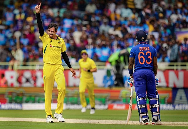 തുടര്ച്ചയായി രണ്ടാം മത്സരത്തിലും സൂര്യകുമാര് യാദവ് ഗോള്ഡന് ഡക്കായി മടങ്ങി. ഒന്നാം ഏകദിനത്തിന് സമാനമായി സ്റ്റാര്ക്കിന്റെ പന്തില് വിക്കറ്റിന് മുന്നില് കുടുങ്ങിയാണ് സൂര്യകുമാര് ഇത്തവണയും മടങ്ങിയത്. ശുഭ്മാന് ഗില് രണ്ട് പന്തില് പൂജ്യവുമായി മടങ്ങി.
