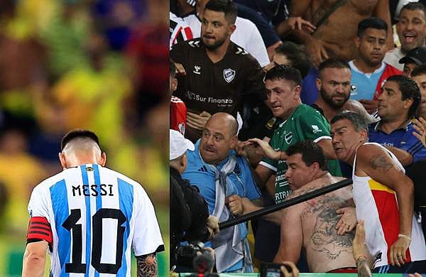 മത്സരത്തിന്റെ തുടക്കത്തില് ദേശീയ ഗാനത്തിനായി ഇരു ടീമുകളുടേയും താരങ്ങള് ഗ്രൗണ്ടില് അണിനിരന്നപ്പോഴായിരുന്നു ഇരു ടീമുകളുടേയും ആരാധകര് തമ്മില് കൈയാങ്കളി നടന്നത്. മെസി അടക്കമുള്ള അര്ജന്റീന താരങ്ങള് ആരാധകരോട് ശാന്തരാകാന് ആവശ്യപ്പെട്ടു. പിന്നാലെ അര്ജന്റീന താരങ്ങള് ഡ്രസിങ് റൂമിലേക്കു തന്നെ മടങ്ങി. പിന്നീട് പൊലീസ് ഇടപെട്ട് രംഗം ശാന്തമാക്കിയാണ് മത്സരം പുനരാരംഭിച്ചത്.