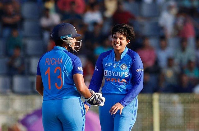 പാകിസ്ഥാനോട് ഞെട്ടിക്കുന്ന തോല്വി വഴങ്ങിയതിന് പിന്നാലെ ബാറ്റിങ് പരീക്ഷണങ്ങള് അവസാനിപ്പിച്ചാണ് ഇന്ത്യ ബംഗ്ലാദേശിന് എതിരെ കളിച്ചത്. ഓപ്പണിങ്ങിലേക്ക് സ്മൃതി മന്ദാനയ്ക്കൊപ്പം ഷഫാലി തിരിച്ചെത്തി. 96 റണ്സാണ് ഓപ്പണിങ് വിക്കറ്റില് മന്ദാനയും ഷഫാലിയും ചേര്ന്ന് കണ്ടെത്തിയത്.