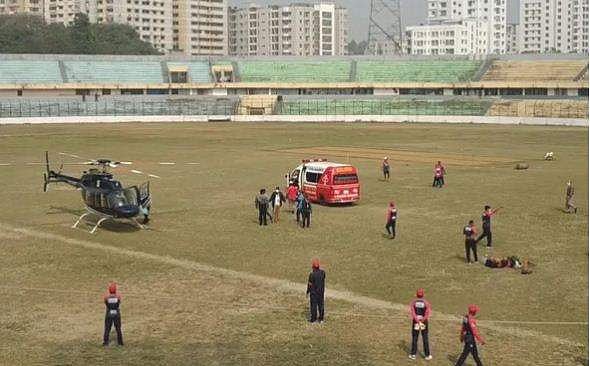 ഹെലികോപ്റ്റര് ഗ്രൗണ്ടിന് നടുക്കായി ലാന്ഡ് ചെയ്തതോടെ കളിക്കാര് ഭയന്ന് ഓടി. ഏതാനും സമയത്തിന് ശേഷമാണ് എയര് ആംബുലന്സ് ആയി ഉപയോഗിച്ച ഹെലികോപ്ടറാണ് അതെന്ന് മനസിലായത്. ജില്ലാ ഭരണകൂടത്തിന്റെ അനുമതിയോടെയായിരുന്നു ഇത്.