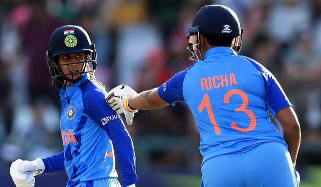 പിന്നാലെ എത്തിയ ജെമീമാ റോഡ്രിഗസുമായി ചേര്ന്ന് ഷഫാലി വര്മ മികച്ച മുന്നേറ്റം നടത്തിയ എന്നാല് 25 പന്തില് 33 റണ്സ് നേടിയിരിക്കെ ഷഫാലിയുടെ വിക്കറ്റ് നഷ്ടപ്പെടുകയായിരുന്നു. അതിനു പിന്നാലെ എത്തിയ ഹര്മാന് പ്രീത് കൗര് (12 റണ്സില് 16) നര്ഷ സന്ധുവിന്റെ ബോളില് കുടുങ്ങി. നാലാം വിക്കറ്റില് ചേര്ന്ന റിച്ച ഘോഷുമായി ജെമീമ നടത്തിയ മുന്നേറ്റമാണ് ഇന്ത്യയെ വിജയത്തിലേക്ക് എത്തിച്ചത്. 38 പന്തില് 53 റണ്സാണ് ജെമീമ അടിച്ചെടുത്തത്. എട്ട് ബൗണ്ടറികള്ക്കൊപ്പമായിരുന്നു ഇന്നിങ്സ്. 20 പന്തില് 31 റണ്സാണ് റിച്ച നേടിയത്. പാക്കിസ്ഥാനു വേണ്ടി നഷ്റ സന്ധു രണ്ട് വിക്കറ്റ് നേടി. സാദിയ ഇക്ബാലും ഒരു വിക്കറ്റ് വീഴ്ത്തി.