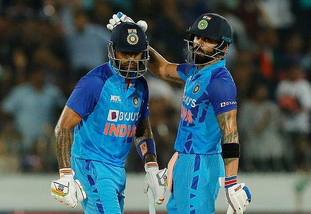 ലക്ഷ്യത്തിലേക്ക് ബാറ്റെടുത്ത ഇന്ത്യക്ക് ആദ്യ ഓവറിൽ തന്നെ ഓപ്പണർ കെഎൽ രാഹുലിന്റെ (നാല് പന്തിൽ ഒന്ന്) വിക്കറ്റ് നഷ്ടമായി. നാലാം ഓവറിൽ ക്യാപ്റ്റൻ രോഹിത് ശർമയും (14 പന്തിൽ 17) മടങ്ങി. എന്നാൽ മൂന്നാം വിക്കറ്റിൽ കോഹ്ലിയും സൂര്യകുമാറും ചേർന്ന് നേടിയ സെഞ്ച്വറി കൂടുകെട്ടാണ് ഇന്ത്യൻ ജയത്തിൽ നിർണായകമായത്.