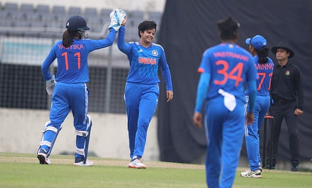 ഷെഫാലി മൂന്ന് വിക്കറ്റുകള് വീഴ്ത്തിയപ്പോള് ദീപ്തി ശര്മയും മികച്ച രീതിയില് പന്തെറിഞ്ഞു. താരം നാലോവറില് 12 റണ്സ് മാത്രം വിട്ടുകൊടുത്ത് വീഴ്ത്തിയത് മൂന്ന് വിക്കറ്റുകള്. മിന്നു മണി നാലോവറില് ഒരു മെയ്ഡനടക്കം ഒന്പത് റണ്സ് മാത്രം വഴങ്ങി രണ്ട് വിക്കറ്റുകള് വീഴ്ത്തി. അനുഷ് റെഡ്ഡി ഒരു വിക്കറ്റെടുത്തു.