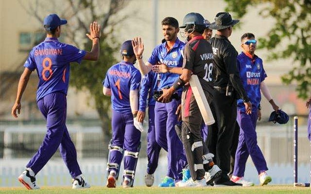 വിജയം തേടിയിറങ്ങിയ യുഎഇയെ ഇന്ത്യൻ ബൗളർമാർ വെള്ളം കുടിപ്പിച്ചു. ഇന്ത്യയുടെ ബൗളിങ്ങിനു മുന്നിൽ താളം കണ്ടെത്താതെ പോയ യുഎഇ 34.3 ഓവറിൽ വെറും 128 റൺസിന് ഓൾ ഔട്ടായി. പന്തുകൊണ്ടും തിളങ്ങിയ രാജ് വർധൻ മൂന്ന് വിക്കറ്റെടുത്തു. ഗർവ് സംഗ്വാൻ, വിക്കി ഒസ്ത്വാൾ, കുഷാൽ ടാംബെ എന്നിവർ രണ്ട് വീതം വിക്കറ്റുകൾ വീഴ്ത്തി. 45 റൺസെടുത്ത കയ് സ്മിത്താണ് യുഎഇയുടെ ടോപ് സ്കോറർ.