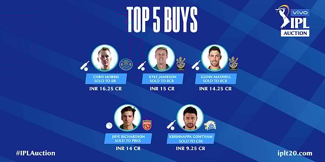 15 കോടി രൂപയ്ക്ക് റോയല് ചാലഞ്ചേഴ്സ് ബാംഗ്ലൂര് സ്വന്തമാക്കിയ കിവീസ് പേസര് കൈല് ജാമിസണാണ് ഉയര്ന്ന രണ്ടാമത്തെ തുക നേടിയത്. 14.25 കോടിക്ക് ബാംഗ്ലൂര് തന്നെ സ്വന്തമാക്കിയ ഓസീസ് താരം ഗ്ലെന് മാക്സ്വെല് മൂന്നാമതും 14 കോടിക്ക് പഞ്ചാബ് കിങ്സ് ടീമിലെത്തിച്ച ഓസീസ് താരം ജൈ റിച്ചാര്ഡ്സന് നാലാമതുമുണ്ട്.9.25 കോടി രൂപയ്ക്ക് ചെന്നൈ സൂപ്പര് കിങ്സ് സ്വന്തമാക്കിയ കൃഷ്ണപ്പ ഗൗതമാണ് ഇന്ത്യന് താരങ്ങളില് ഒന്നാമന്. ദേശീയ ജഴ്സിയണിയാത്ത താരങ്ങളില് ഉയര്ന്ന വില ലഭിച്ചതും ഗൗതത്തിനു തന്നെ.