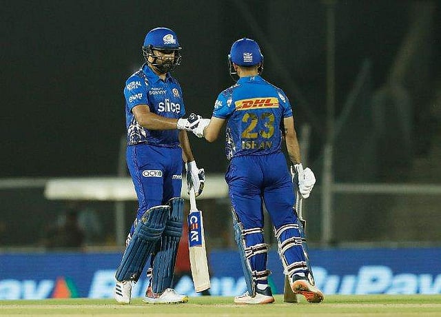 ഇഷാൻ കിഷൻ 29 പന്തിൽ 45 റൺസും രോഹിത് ശർമ 28 പന്തിൽ 43 റൺസുമെടുത്തു. രോഹിത് ശർമയാണ് ആദ്യം പുറത്തായത്. മുംബൈ ക്യാപ്റ്റനെ ഗുജറാത്ത് സ്പിന്നർ റാഷിദ് ഖാൻ എൽബിയിൽ കുടുക്കുകയായിരുന്നു. 13 റൺസെടുത്ത സൂര്യകുമാർ യാദവിനെ പ്രദീപ് സങ്വാന്റെ പന്തിൽ റാഷിദ് ക്യാച്ചെടുത്തു മടക്കി. സ്കോർ 111ൽ നിൽക്കെ ഇഷാൻ കിഷൻ അൽസാരി ജോസഫിന്റെ പന്തിൽ പുറത്തായി.