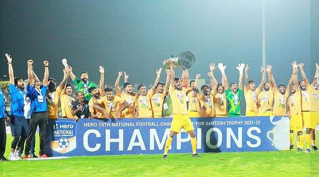 മലപ്പുറം: സന്തോഷ് ട്രോഫി ഫുട്ബോള് ടൂര്ണമെന്റില് കേരളം ചാമ്പ്യന്മാര്. ഫൈനലില് ബംഗാളിനെ പെനാല്റ്റി ഷൂട്ടൗട്ടില് കീഴ്പ്പെടുത്തിയാണ് (5-4) കേരളം കിരീടത്തില് മുത്തമിട്ടത്. കേരളത്തിന്റെ ഏഴാം കിരീട നേട്ടമാണിത്. ടൂര്ണമെന്റില് ഒരു മത്സരം പോലും തോല്ക്കാതെയാണ് കേരളത്തിന്റെ വിജയം.