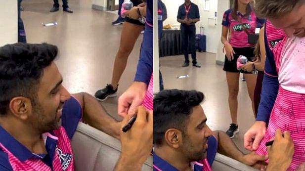 രണ്ട് ജഴ്‌സികളിലാണ് ബട്ട്‌ലര്‍ അശ്വിന്റെ ഓട്ടോഗ്രാഫ് വാങ്ങിക്കുന്നത്. മറ്റ് പല രാജസ്ഥാന്‍ താരങ്ങളുടേയും ഓട്ടോഗ്രാഫ് ബട്ട്‌ലറുടെ ജഴ്‌സിയില്‍ കാണാം. ഈ രണ്ട് പേര്‍ എന്ന ക്യാപ്ഷനോടെയാണ് രാജസ്ഥാന്‍ ഇരുവരുടേയും വീഡിയോ പങ്കുവെച്ചത്. ഓറഞ്ച് ക്യാപ്പോടെയാണ് ബട്ട്‌ലര്‍ സീസണ്‍ അവസാനിപ്പിച്ചത്. 863 റണ്‍സാണ് ബട്ട്‌ലര്‍ അടിച്ചു കൂട്ടിയത്.