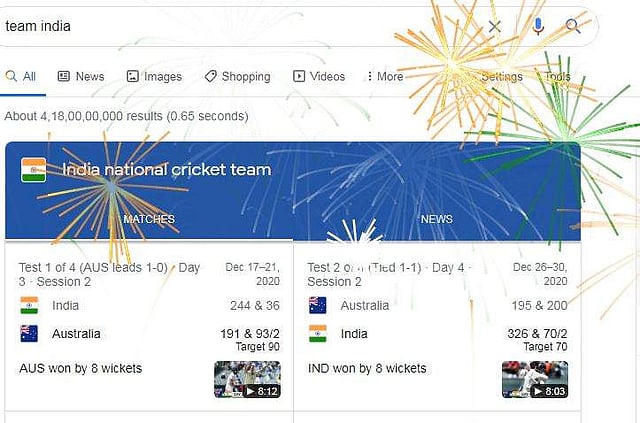 ഇന്ത്യ- ഓസ്ട്രേലിയ പരമ്പര നേട്ടം ഗൂഗിള് ആഘോഷിച്ചത് പടക്കം പൊട്ടിച്ചാണ്. വെര്ച്വല് വെടിക്കെട്ടോടെയാണ് ഗൂഗിള് വിജയം ആഘോഷമാക്കിയത്. ഗൂഗിള് സെര്ച്ചില് ടീം ഇന്ത്യ, ഇന്ത്യന് ക്രിക്കറ്റ് ടീം, ഇന്ത്യ നാഷണല് ക്രിക്കറ്റ് ടീം എന്നൊക്കെ ടൈപ്പ് ചെയ്താല് ഇന്ത്യ- ഓസ്ട്രേലിയ സ്കോര് കാര്ഡിനൊപ്പം വെര്ച്വല് വെടിക്കെട്ടും കാണാം.