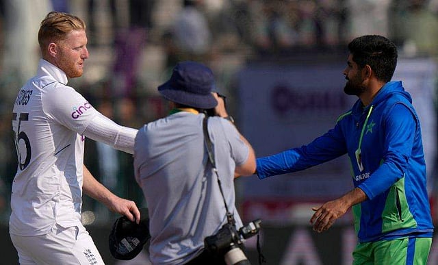 പാക് ക്യാപ്റ്റൻ ബാബർ അസമുമായി ഹസ്തദാനം ചെയ്യുന്ന ഇം​ഗ്ലണ്ട് നായകൻ ബെൻ സ്റ്റോക്സ്/ പിടിഐ