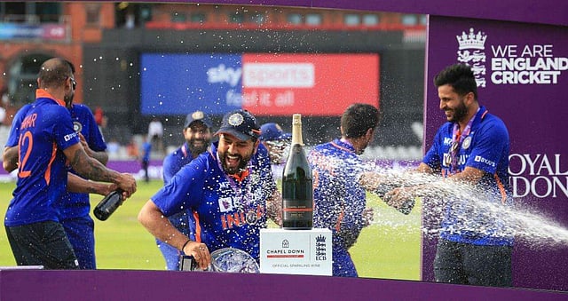 സമ്മാനദാന ചടങ്ങിലും കളിക്കാരുടെ ഷാംപെയ്ന് ആഘോഷം നിറഞ്ഞതോടെ ഫോട്ടോയ്ക്ക് പോസ് ചെയ്യാന് പറഞ്ഞ് രോഹിത് ശര്മയ്ക്ക് ഋഷഭ് പന്തിനേയും ശിഖര് ധവാനേയുമെല്ലാം നിര്ബന്ധിക്കേണ്ടതായി വന്നു. അര്ഷ്ദീപ് സിങ്ങിന്റെ കൈകളിലേക്കാണ് രോഹിത് ട്രോഫി നല്കിയത്.