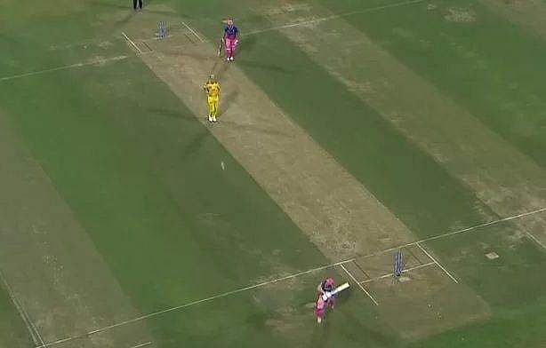 17ാം ഓവറില് രാജസ്ഥാന് റോയല്സിന് ജയിക്കാന് 19 റണ്സ് വേണം എന്ന ഘട്ടത്തില് നില്ക്കെയാണ് രസകരമായ സംഭവം. കറാന്റെ കൈകളില് നിന്ന് പന്ത് സ്ലിപ്പായി. പിച്ചിന് പുറത്തേക്കാണ് പന്ത് വന്നത്. ഉയര്ന്ന് പൊങ്ങിയ കറാന്റെ പന്ത് അടിക്കാനായി ക്രീസില് നിന്ന് ഫിലിപ്പ്സ് ക്രീസിന് പുറത്തേക്ക് ഓടി.