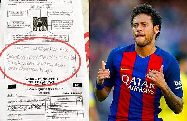 എന്നാൽ കടുത്ത ബ്രസീൽ ഫാനായ റിസ ഫാത്തിമ എഴുതിയ ഉത്തരമാണ് ഇപ്പോൾ സമൂഹമാധ്യമങ്ങളിൽ വൈറൽ. തിരൂർ പുതുപ്പള്ളി ശാസ്താ എഎൽപിഎസിലെ നാലാംക്ലാസുകാരിയാണ് റിസ ഫാത്തിമ. ‘ഞാൻ എഴുതൂല, ഞാൻ ബ്രസീൽ ഫാൻ ആണ്. എനിക്ക് നെയ്മാറിനെയാണ് ഇഷ്ടം. മെസിയെ ഇഷ്ടമല്ല’– എന്നായിരുന്നു റിസയുടെ ഉത്തരം.