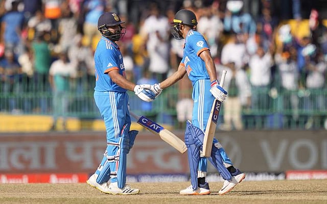ക്യാപ്റ്റന് രോഹിത് ശര്മയും ശുഭ്മാന് ഗിലും ചേര്ന്ന ഓപ്പണിങ് സഖ്യം ഇന്ത്യക്ക് മിന്നല് തുടക്കം സമ്മാനിച്ചു. ഇരുവരും അര്ധ സെഞ്ച്വറി കുറിച്ചാണ് മടങ്ങിയത്. രോഹിത് ശര്മയാണ് ആദ്യം കീഴടങ്ങിയത്. നായകന് 49 പന്തില് ആറ് ഫോറും നാല് സിക്സും സഹിതം താരം 56 റണ്സെടുത്തു.