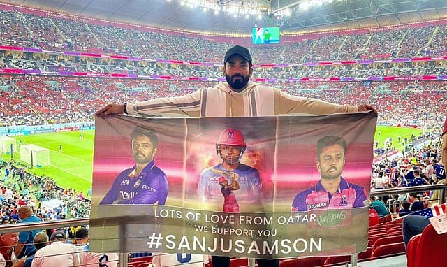സഞ്ജുവിന് പിന്തുണ പ്രഖ്യാപിക്കുന്ന പോസ്റ്ററുമായാണ് ആരാധക കൂട്ടം ഖത്തറിലെ സ്റ്റേഡിയത്തിൽ പ്രത്യക്ഷപ്പെട്ടത്. ഇതിന്റെ ചിത്രം രാജസ്ഥാൻ റോയൽസ് ടീം സാമൂഹിക മാധ്യമങ്ങളിൽ പങ്കിട്ടിട്ടുമുണ്ട്. ഖത്തർ ലോകകപ്പിൽ നിങ്ങൾ ആരെയാണ് പന്തുണയ്ക്കുന്നത്- എന്ന കുറിപ്പോടെയാണ് ടീം ഇതിന്റെ ചിത്രങ്ങൾ പങ്കിട്ടത്.