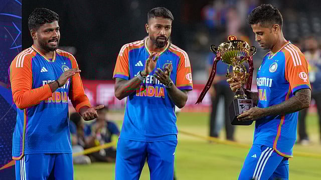 രണ്ടാം വിക്കറ്റില് സഞ്ജു സാംസണും ക്യാപ്റ്റന് സൂര്യകുമാര് യാദവും ചേര്ന്ന വെടിക്കെട്ട് കൂട്ടുക്കെട്ടാണ് ഇന്ത്യക്ക് കൂറ്റന് സ്കോര് സമ്മാനിച്ചത്. 35 പന്തില്നിന്ന് 75 റണ് ആണ് ക്യാപ്റ്റന് സൂര്യകുമാര് യാദവ് നേടിയത്. ഇതിൽ ആറ് സിക്സറുകളും എട്ട് ബൗണ്ടറികളും ഉൾപ്പെടുന്നു. പിന്നാലെയെത്തിയ റിയാന് പരാഗും ഹര്ദിക് പാണ്ഡ്യയും വെടിക്കെട്ട് തുടർന്നു. പരാഗ് 13 പന്തില് നിന്ന് 34 റൺസ് നേടി. 18 പന്തില് നിന്ന് 47 റൺസ് വാരിക്കൂട്ടിയ ശേഷമാണ് ഹർദിക് മടങ്ങിയത്.