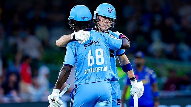 തുടരെ ആറ് സിക്സുകള് 18, 19 ഓവറുകളിലാണ് പിറന്നത്. 18ാം ഓവറിലെ അവസാന രണ്ട് പന്തുകളില് ബ്രെവിസ് കോര്ബിന് ബോഷിനെ സിക്സര് പായിച്ചു. 19ാം ഓവര് എറിയാനെത്തിയ ഡ്വെയ്ന് പ്രിട്ടോറിയസിനെ ആദ്യ നാല് പന്തുകളിലും സിക്സര് പായിച്ചാണ് റുതര്ഫോര്ഡ് വരവേറ്റത്. ഇന്നിങ്സിൽ ആറ് തുടർ സിക്സുകളാണ് തലങ്ങും വിലങ്ങും പാഞ്ഞത്.