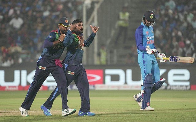 ഇന്ത്യൻ താരം ദീപക് ഹൂഡയുടെ വിക്കറ്റ് ആഘോഷിക്കുന്ന ശ്രീലങ്കൻ താരങ്ങൾ/ ചിത്രം; പിടിഐ