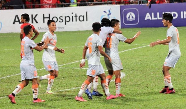 ആദ്യം പകുതി തീരാൻ നിമിഷങ്ങൾ മാത്രമുള്ളപ്പോൾ 45ാം മിനിറ്റിൽ മാലിദ്വീപിന് അനുകൂലമായി റഫറി പെനാൽറ്റി വിധിച്ചു. കിക്കെടുത്ത അലി അഷ്ഫാഖിന് തെറ്റിയില്ല. പന്ത് അനായാസം വലയിലെത്തിച്ച് താരം ആതിഥേയർക്ക് സമനില സമ്മാനിച്ചു.