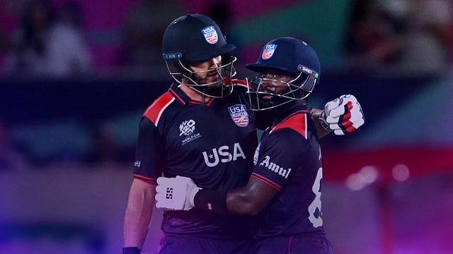 ആരോണ് ജോണ്സിന്റെ വെടിക്കെട്ട് ബാറ്റിങ്ങാണ് അമേരിക്കയ്ക്ക് വിജയം സമ്മാനിച്ചത്. 40 പന്തില് പുറത്താകാതെ 94 റണ്സ് ആണ് ആരോണ് ജോണ്സ് നേടിയത്. പത്തു സിക്സുകളുടെ അകമ്പടിയോടെയായിരുന്നു ജോണ്സിന്റെ വെടിക്കെട്ട് ബാറ്റിങ്.