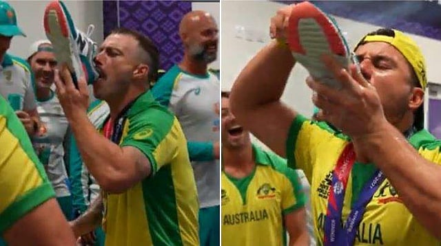 പാകിസ്ഥാനെതിരായ സെമി ഫൈനൽ മത്സരത്തിൽ ഓസീസിനെ വിജയത്തിലെത്തിച്ച മാത്യു വെയ്ഡ്, വലതു കാലിലെ ഷൂ വലിച്ചൂരിയതിനു ശേഷം ഷൂസിനുള്ളിൽ ബീയർ ഒഴിച്ചു കുടിക്കുന്നതു വീഡിയോയിൽ വ്യക്തമായി കാണാം. പിന്നാലെ വെയ്ഡിൽ നിന്ന് ഷൂ വാങ്ങി തന്റെ പക്കൽ ഉണ്ടായിരുന്ന ബീയർ ഷൂസിനുള്ളിൽ തന്നെ ഒഴിച്ചതിനു ശേഷം മാർക്കസ് സ്റ്റോയ്നിസ് കുടിക്കുന്നതും വീഡിയോയിലുണ്ട്. നിറഞ്ഞ പിന്തുണയുമായി ഓസീസ് ടീമിലെ സഹതാരങ്ങളും ഇരുവർക്കും ചുറ്റുമുണ്ട്.