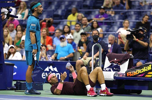 ലോ ബാക്ക്ഹാന്ഡ് ഷോട്ട് കളിക്കുന്നതിന് ഇടയില് ടര്ഫില് തട്ടി ബൗണ്സ് ചെയ്ത നദാലിന്റെ റാക്കറ്റ് താരത്തിന്റെ മൂക്കില് ഇടിച്ചു. മൂക്ക് മുറിഞ്ഞ് രക്തം വരികയും ചെയ്തതോടെ നദാലിന് മെഡിക്കല് ബ്രേക്ക് എടുക്കേണ്ടി വന്നു.