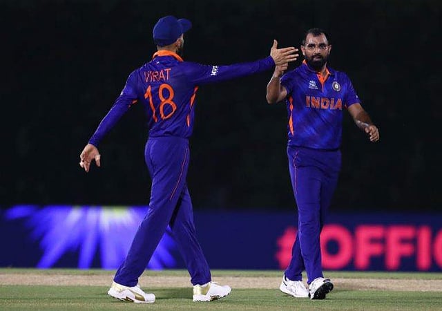 ഇംഗ്ലണ്ടിന്റെ വിക്കറ്റ് വീഴ്ത്തിയ ഷമിയെ അഭിനന്ദിക്കുന്ന കൊഹ്‌ലി