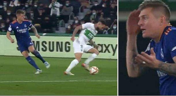 മത്സരം പുരോഗമിക്കുന്നതിനിടെ എല്ചെ താരം ടെറ്റെ മൊറെന്റെയെ ഫൗള് ചെയ്തെന്ന് കാണിച്ചാണ് ടോണി ക്രൂസിന് നേരെ റഫറി മഞ്ഞക്കാര്ഡ് കാണിച്ചത്. എന്നാല് ടോണി ക്രൂസ് പന്തിലോ, ടെറ്റെയുടെ ശരീരത്തിലോ ഒന്നും തൊടുക പോലും ചെയ്തിട്ടില്ല എന്ന വീഡിയോ ദൃശ്യങ്ങളില് വ്യക്തം. ടെറ്റെ കാല്തെന്നി ഗ്രൗണ്ടില് വീഴുകയായിരുന്നു. എന്നാല് ഇതൊന്നും പരിഗണിക്കാതെ റഫറി ഈ വീഴ്ചയ്ക്ക് ടോണി ക്രൂസിന് മഞ്ഞക്കാര്ഡ് കാണിക്കുകയായിരുന്നു.