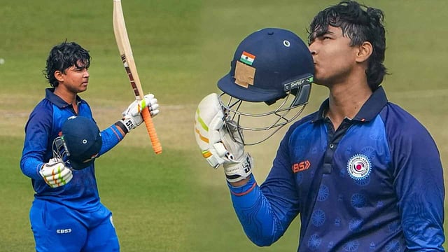 മത്സരത്തിൽ 84 പന്തിൽ 190 റൺസെടുത്ത വൈഭവിന്, വെറും 10 റൺസ് അകലെയാണ് ഇരട്ട സെഞ്ചറി നഷ്ടമായത്. ആകെ 15 സിക്സും 16 ഫോറുമാണ് വൈഭവിന്റെ ബാറ്റിൽ നിന്നു പിറന്നത്. 54 പന്തില് 150 റണ്സ് തികച്ച വൈഭവ്, ലിസ്റ്റ് എ ക്രിക്കറ്റിലെ അതിവേഗ 150 റണ്സിന്റെ ലോക റെക്കോര്ഡും സ്വന്തമാക്കി. 64 പന്തില് 150 റണ്സടിച്ച ദക്ഷിണാഫ്രിക്കൻ താരം എബി ഡിവില്ലിയേഴ്സിന്റെ റെക്കോര്ഡാണ് വൈഭവ് തകർത്തത്.