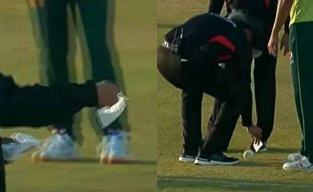 സിംബാബ്വെ ഇന്നിങ്‌സിന്റെ 11ാം ഓവറിലാണ് സംഭവം. തന്റെ രണ്ടാം ഓവര്‍ എറിയാനാണ് വഹാബ് എത്തിയത്. എന്നാല്‍ അബദ്ധത്തില്‍ വഹാബ് പന്തില്‍ ഉമിനീര് പുരട്ടി. അമ്പയര്‍മാരായ അലീം ദാറും യാഖൂബിന്റേയും കണ്ണിലേക്ക് ഇത് എത്തി.