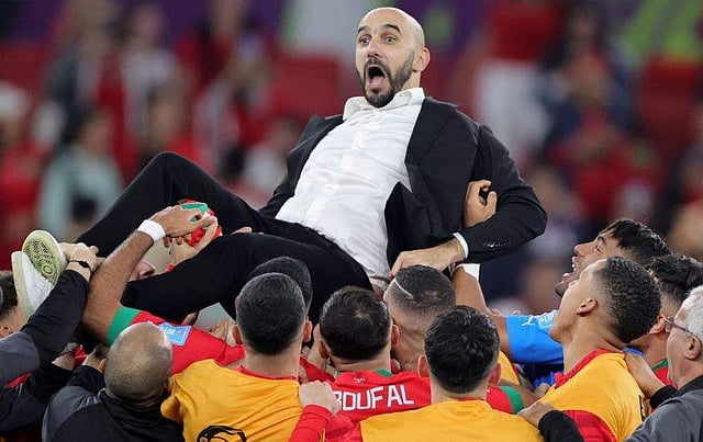 റെ​ഗ്റോ​ഗിയെ എടുത്തുയർത്തി ആഘോഷിക്കുന്ന മൊറോക്കോ ടീം/ ട്വിറ്റർ