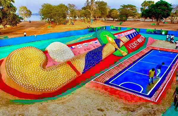 മഹാനദിയുടെ തീരത്ത് മണലില് തീര്ത്ത ലോകത്തിലെ ഏറ്റവും വലിയ ഹോക്കി സ്റ്റിക്ക് ഒരുങ്ങി. അഞ്ച് ടണ്ണോളം മണ്ണ് ഉപയോഗിച്ചാണ് 105 അടി നീളമുള്ള സ്റ്റിക്ക് നിര്മ്മിച്ചിരിക്കുന്നത്. 5000 ഹോക്കി ബോളുകളും ഇതിനായി ഉപയോഗിച്ചിട്ടുണ്ട്. പ്രശ്സ്ത കലാകാരന് പത്മശ്രീ സുദര്ശന് പട്നായിക് ആണ് ഈ മനോഹര സൃഷ്ടി ഒരുക്കിയത്.