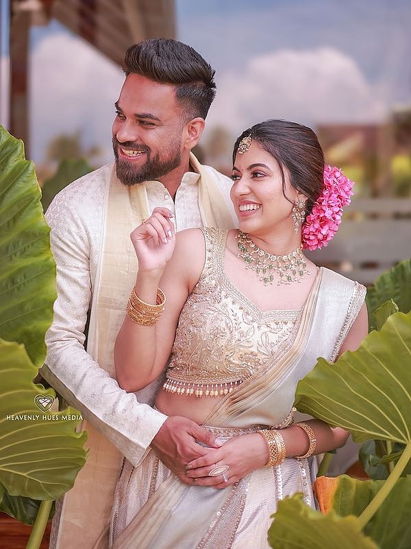ഗോൾഡൻ നിറത്തിലെ ലെഹങ്കയിലാണ് അഞ്ജുവിനെ വിവാഹനിശ്ചയ ചിത്രങ്ങളിൽ കാണാനാവുക. ഇൻസ്റ്റഗ്രാം