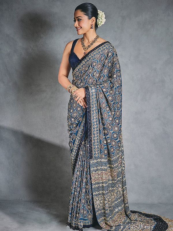പരമ്പരാഗത ജ്യാമിതീയ പാറ്റേണുകളും സീക്വൻസുകളും കൊണ്ട് അലങ്കരിച്ച നീല അജ്രാഖ് സാരിയാണ് താരം ഉടുത്തിരുന്നത്.